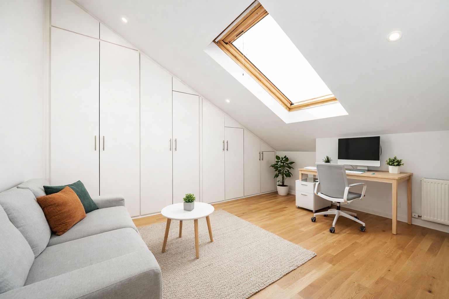 Podkroví se často mění v pracovnu, ateliér nebo místnost na cvičení. Vestavěná skříň zde funguje jako elegantní úkryt na kabely, šanony, techniku, materiál i náčiní. Výsledkem je vizuálně čistý prostor, ve kterém se lépe pracuje i odpočívá.